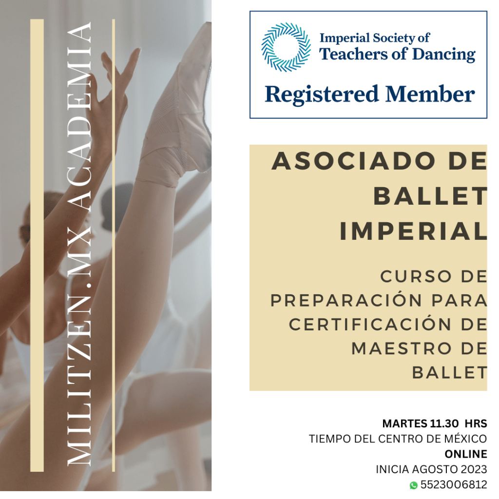 Estudios de Diplomado en historia anatomía psicología y música aplicada a a la danza por la Royal Academy of Dance RAD y la Imperial Societyof Teachers of Dancing ISTD